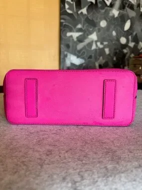 Bright hot pink leather tote with structured silhouette. Dual top handles for easy carry. Comes with dust bag. No wear on corners or handles. Small mark on the front of the bag. Please see photos. Some discoloration on bottom of bag. Could probably be wiped off. It’s gorgeous!!
