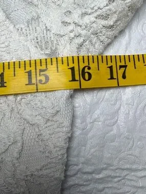 Cream lace overlay with a scoop neckline. Three-quarter lace sleeves offer light coverage. Fully lined bodice for smooth wear. Feminine floral lace throughout the dress.