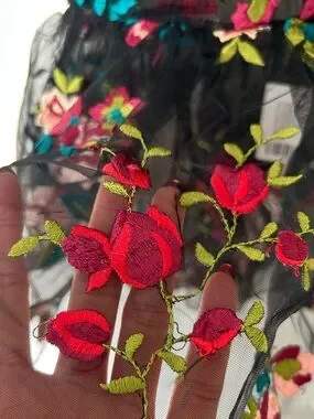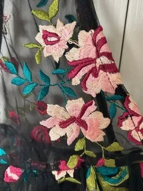 Black sheer tank with multicolor floral embroidery. Vivid pink, teal, green and cream floral details. Feminine peplum silhouette. Lightweight and breathable. Great piece for layering!