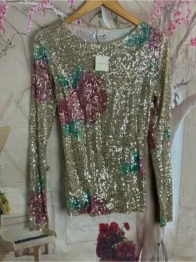 Sparkling gold sequin top with pink floral motifs and green leaves. Crew neckline and long sleeves. Lightweight, slightly relaxed fit. Eye-catching for parties and nights out.