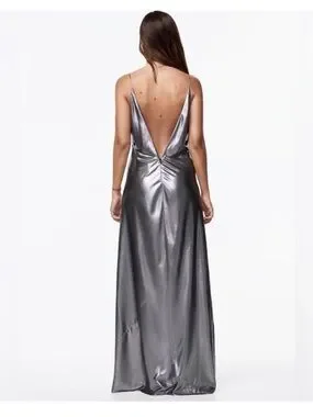 This slip dress is a super sexy silver number so metallic that it takes on an almost liquid metal look.
