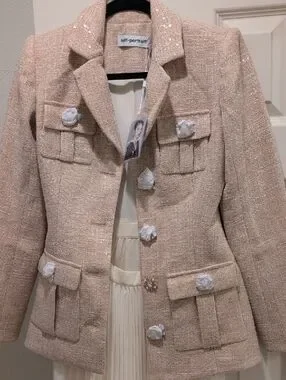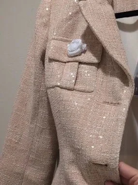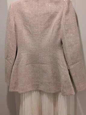 Structured tweed blazer in a soft peachy cream pale blush tone. Decorative fabric rosette buttons and flap pockets. Refined tailored shoulders and classic notch lapel. Subtle shimmer woven into the fabric for a polished look.
