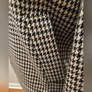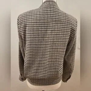 Black, dark brown, tan and cream colorway. Two darts at the lower back of jacket, adds a cute touch.