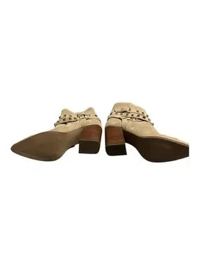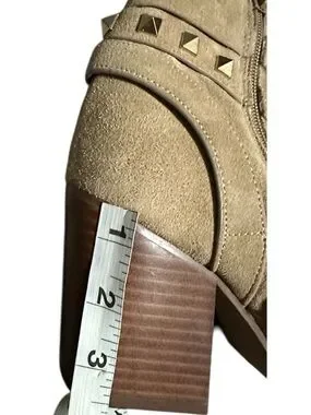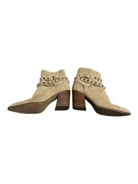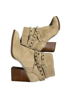 Beige suede ankle boots with stacked wooden block heel. Wraparound studded straps with buckle detail. Pointed toe and sleek silhouette. Versatile for casual or dressy looks.
