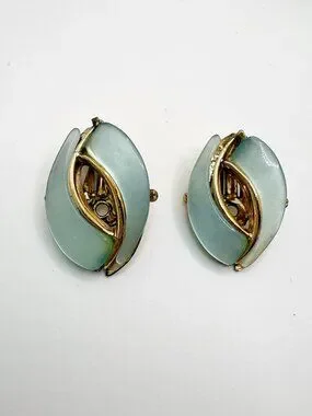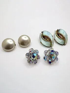 Lovely mixed lot of vintage earrings featuring a variety of classic mid-century styles. This set includes lucite earrings, aurora borealis (AB) beaded cluster earrings, and faux pearl button earrings marked “Japan.”