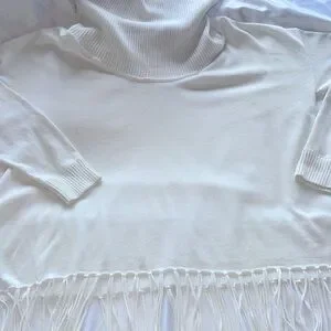 MICHAEL Michael Kors Creamy White Funnel Neck Shawl Collar Oversized Cotton Knit Sweater Size Large. Statement Fringe Hem & Funnel neck Cowl Neck cotton blend lightweight knit Sweater. Long knotted fringe adds a fun vibe to this soft sweater topped with a slouchy, easy Cowl or funnel neckline. Dropped shoulder sleeves. Pullover with Fringe hemline. Ribbed cuffs. 52% cotton, 45% polyester, 3% Angora. There are faint stains on the interior of the cowl neck but cannot see when wearing. See photo. Approximate flat measurements in photos