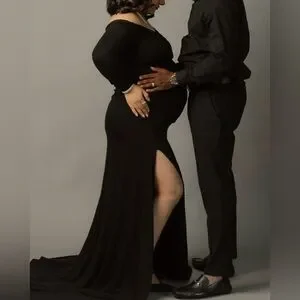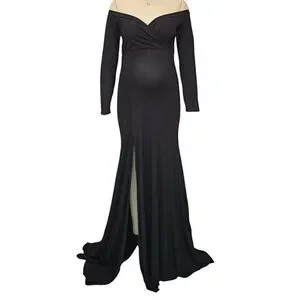 Stunning black long-sleeve maternity dress with an off-shoulder neckline. Stretchy fabric gently supports the bump for a flattering fit. High side slit adds elegant movement and a modern silhouette. Perfect for maternity photoshoots!