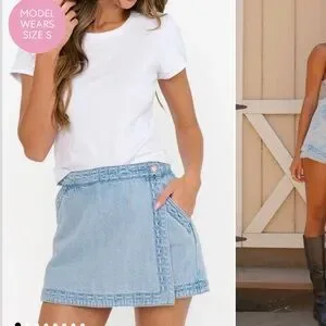 A-line denim mini skirt in a light wash. Wrapped front panel with a single button closure. Woven trim along waistband and hem. Functional side pockets. Clean, casual everyday style.