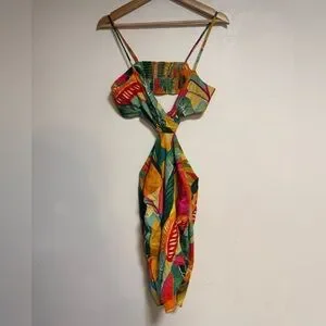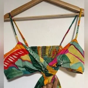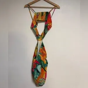 Vibrant tropical print mini dress with adjustable spaghetti straps and a flattering cutout waist. Lightweight fabric drapes smoothly for a breezy fit. Perfect for warm-weather outings and beachside events. Available in yellow and green multi-color print.
