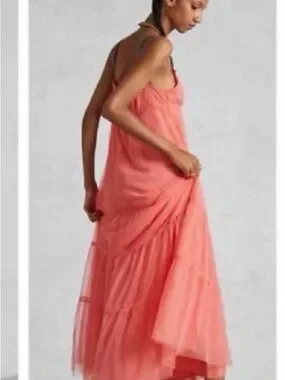 Maeve Anthropologie Coral tulle Maxi Dress with Spaghetti Straps Small