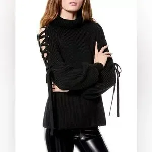 Alice and Olivia, Izetta sweater, lace up sweater, black wool sweater, turtleneck knit, designer sweater, balloon sleeve sweater, luxury knitwear, fall winter sweater, NWT designer