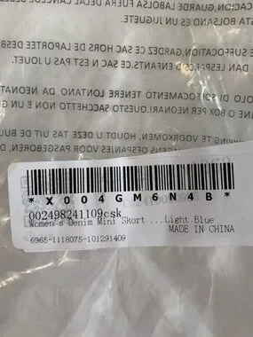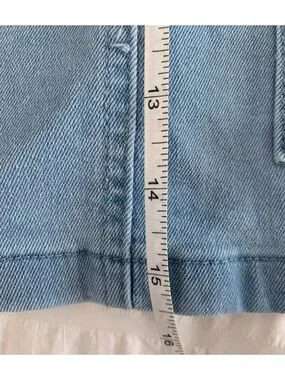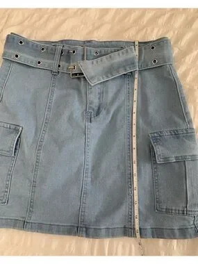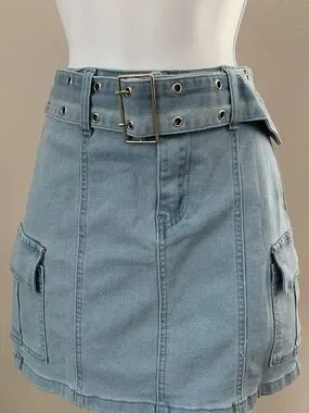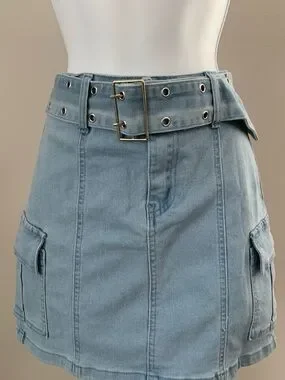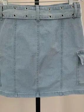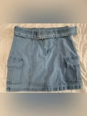 Light wash denim mini skirt by CiMuk. Soft faded blue with casual stitched detailing. Trendy everyday piece with a clean, worn look. Skirt has cargo pockets and a removable belt. Size small is 65% cotton, 23% polyester, 10% rayon and 2% spandex.