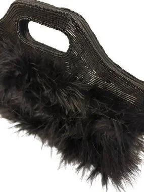 Black Faux Fur Beaded Handle Evening Clutch Bag By Ermo