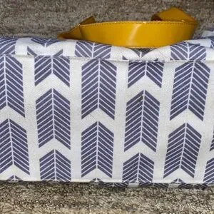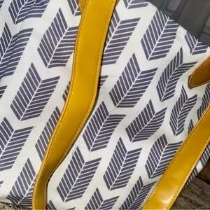 Canvas tote with navy arrow pattern on a cream background. Bright mustard yellow shoulder straps for a pop of color. Open top design with simple, roomy interior. Casual, versatile bag for daily use.