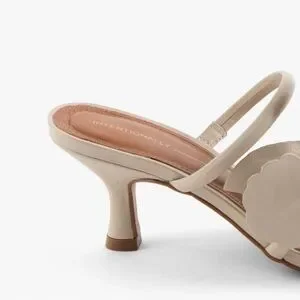Features: Slip-on style, backless design, leather uppers, three skinny straps, square open toe, leather flower applique, kitten heel, padded footbed