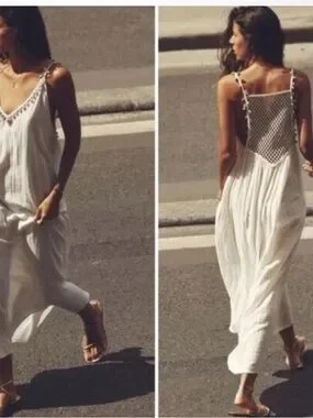 Lightweight cream midi dress. Features crochet neckline and shell-like trim. Flowy, effortless silhouette. Perfect for beach or casual summer days.