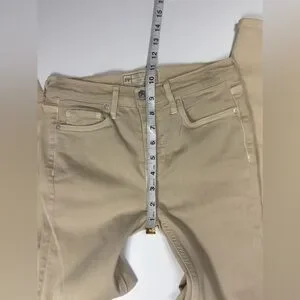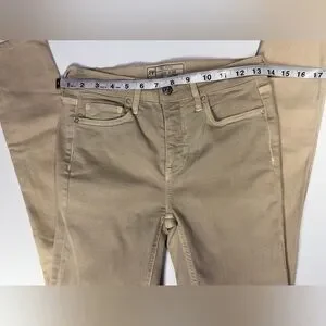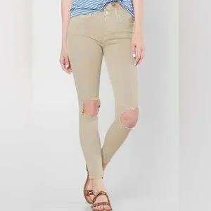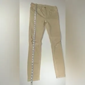 Trendy tan skinny jeans with stylish distressing. Ideal for casual outings.