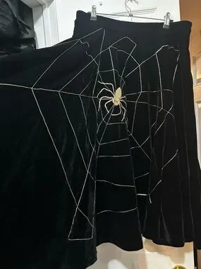 Black velvet circle skirt with metallic spiderweb embroidery. Full, flowing silhouette. Eye-catching embroidered web detail. Versatile for themed or evening wear. New with tags. No longer in production. Matching cape and shoes listed!