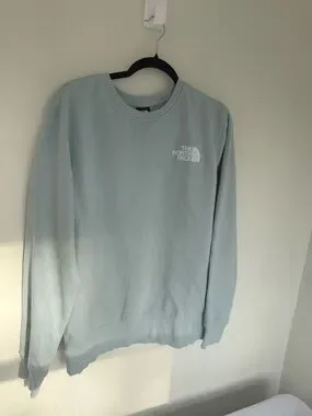 Soft pale blue crewneck from The North Face. Small chest logo for subtle branding. Ribbed collar and cuffs for a snug fit. Lightweight and easy to layer. Unisex