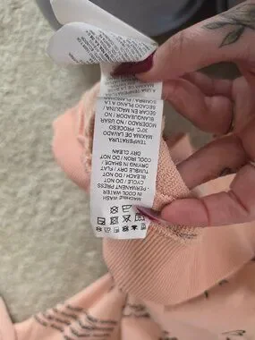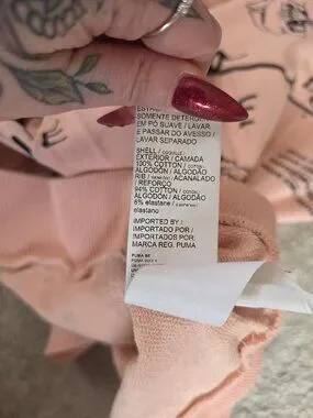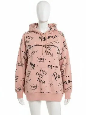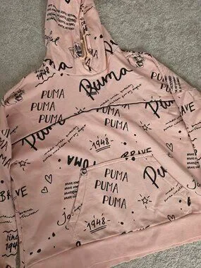 So cute and so cozy! 🩷 This Puma pullover hoodie is covered in the most adorable all-over black graffiti print on a soft blush pink base — "BRAVE," "joyful," "1948," Puma script, puma cat illustrations, hearts & stars all over front, back, sleeves and hood.