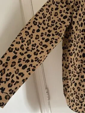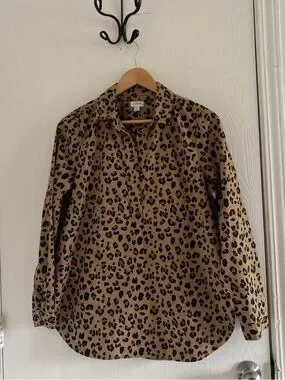 Classic and stylish J.Crew leopard print popover top in excellent used condition. This versatile piece features a timeless brown and black animal print, a flattering relaxed fit, and a partial button front for an effortless look.