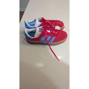 Adidas Gazelle Bold sneakers elevate a classic silhouette with a striking triple-layered platform gum sole. These vibrant kicks feature a rich red suede upper contrasted by iconic sky blue serrated three-stripes and heel tabs. A textured white tongue and classic lace-up closure provide a secure fit, while the durable rubber outsole ensures traction. Perfect for adding a bold, retro-inspired pop of color to any casual outfit, these platforms combine heritage sporty vibes with modern height. These shoes are in excellent pre-owned condition with very light wear on the outsoles.
