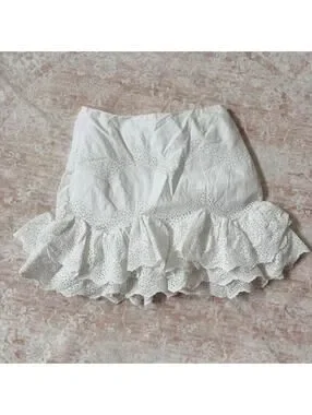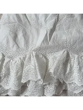 Super pretty white mini skirt with eyelet lace detailing and layered ruffle hem. Gives major cottagecore / coquette vibes—perfect for summer outfits, vacations, or dressed up with boots.