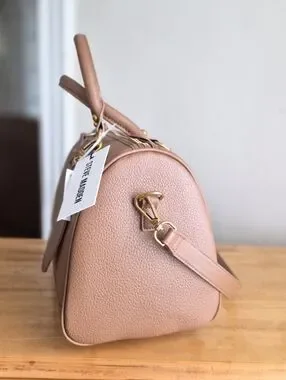 Up for sale is the viral and highly sought-after Steve Madden BMateo Satchel. This chic "bowling bag" or barrel-style silhouette is the perfect budget-friendly alternative to high-end designer styles like the Coach Rowan or LV Speedy.Key Features:Material: High-quality pebbled faux leather with a premium feel.Versatility: Dual rolled top handles for hand-carrying plus a detachable, adjustable crossbody strap for hands-free convenience.Details: Features the iconic stitched Steve Madden oval logo on the front and includes the matching hanging leather luggage tag.Interior: Spacious main compartment with a secure zip-top closure and internal pockets for organization.Dimensions: Approximately 10" L x 7" H x 6" D