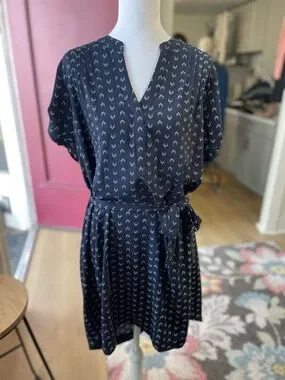 Navy dress with small white abstract print. V-neckline for a clean look. Relaxed fit with subtle shaping. Versatile piece for day or evening.