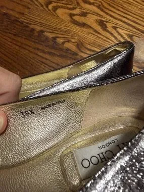 Elegant Jimmy Choo ballet flats in metallic gray. Soft leather cap-toe with a subtle shimmer upper for a refined look. Cushioned insole provides comfortable all-day wear. Versatile design pairs well with both casual and dress outfits. Worn only two times.