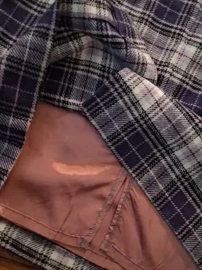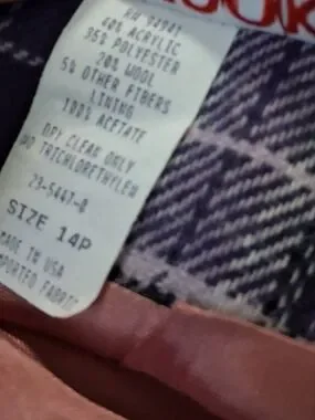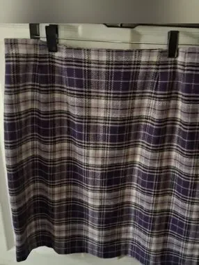 Preowned in great condition. Women's. Size 14P (Petite). Different shades of Purple, Black and White in color. Wool blend. Can be worn dressy or casual. Lined. Zips up in the back for closure. Plaid patterns. Vintage