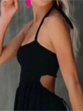 Sleek halter neckline with square bodice. Flowy maxi silhouette for effortless movement. Ruffle hem adds feminine detail. Versatile piece for day or night looks.