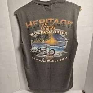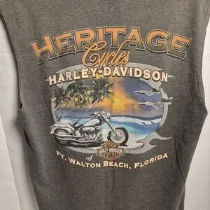 Authentic Harley-Davidson sleeveless tee featuring a bold skull graphic on the front and a large Heritage Cycles Harley-Davidson – Ft. Walton Beach, Florida graphic on the back. Classic biker style with a cut-off sleeve look.