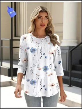 3/4 Sleeve Crew Neck Tunic Top, Loose Fit, Pleated Front, Polyester Blend