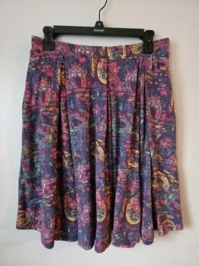Vibrant purple A-line skirt featuring a colorful floral paisley print. Lightweight, flowy fabric for comfortable all-day wear. Elasticized waistband for a flexible fit. Perfect for casual or dressy outfits.