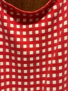 Bright red gingham dress with a tiered skirt for playful movement. Lightweight, breathable fabric for everyday comfort. Long elasticized sleeves for easy wear and a relaxed fit. Classic red and white check pattern perfect for casual outings and events.