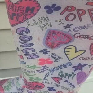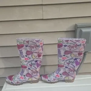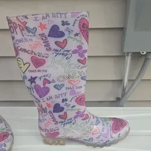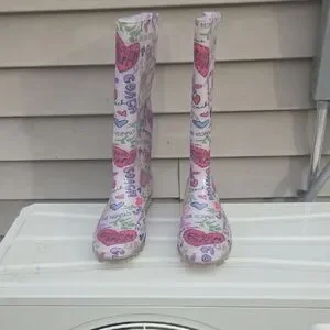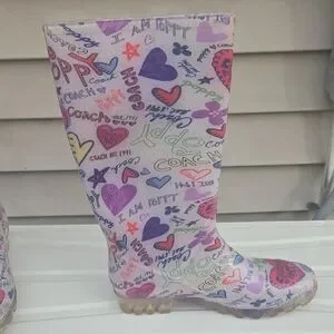 Stylish Coach rain boots featuring a pink and multicolor logo and heart print. Waterproof design keeps feet dry in wet weather. Cushioned insole offers all-day comfort. Easy pull-on shaft for quick wear. Fashionable pink pattern that pairs well with casual outfits.