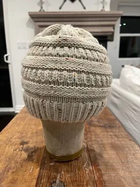 Soft knit beanie in cream with colorful speckled flecks. Ribbed cuff and textured stitch detail. Cozy, casual accessory for cool weather.