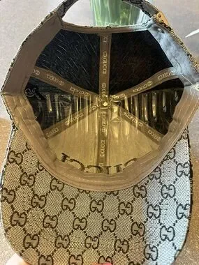 Signature GG monogram pattern across the cap. Embroidered GUCCI logo on the front. Iconic red and green web stripe down center and side. Classic baseball cap silhouette with curved brim.