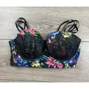 Cacique Women's Longline Multi-way Bra Floral Tropical Print Black Size 40 D