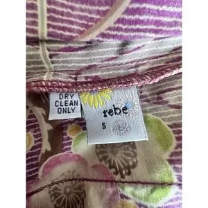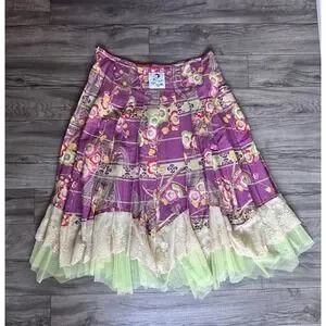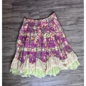 Rebe Layered Floral Skirt Size S Boho Lace Tulle Hem Pleated Statement Unique. Dry Clean Only. This is a spectacular and artistic piece by designer Rebe (Debra Weiss). This skirt stands out for its vibrant Japanese-inspired floral print in violet, green and red tones, combined with a vertical panel design that stylizes the figure. What really makes this garment unique is its multi-layered hem: a layer of cream-colored embroidered lace on a pistachio green tulle base that adds volume and a boho -Chic