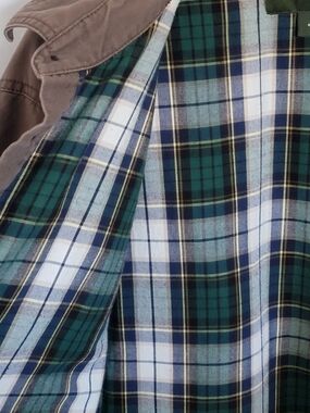 Eddie Bauer men's jacket, rugged workwear styling with button-front and chest pockets, comfortable plaid-lined interior for added warmth, versatile brown color pairs well with casual outfits, durable, work jacket, 100% cotton