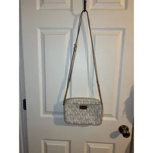 TMichael Kors Jet Set Large East West (EW) Crossbody Bag in the "Vanilla" signature logo print.