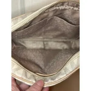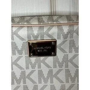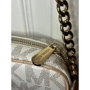 This classic design features a durable PVC exterior with the iconic MK monogram, beige leather trim, and a gold-tone chain-link and leather adjustable strap.