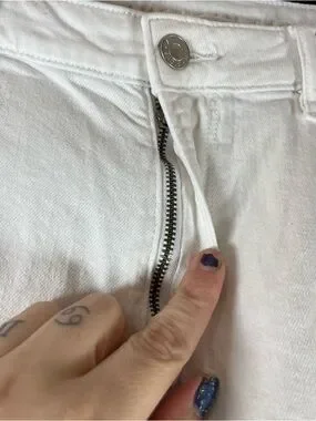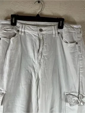 Side cargo pockets. White garment wash. High-waisted, with a wide leg and slouchy long inseam