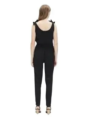 Sleek black one-piece with adjustable tie shoulder straps. Elasticized waist for a snug, comfy fit. Straight-leg silhouette for easy movement. Simple, versatile style for everyday wear.