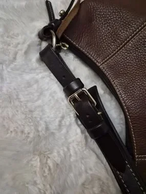Classic Dooney & Bourke shoulder bag in rich brown pebbled leather. Features adjustable straps with gold-tone hardware and contrast stitching. Stylish everyday bag with a branded logo plaque for a polished finish.