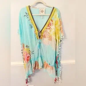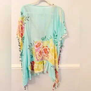 Anthropologie Z&L Made with With Love Boho Kaftan Aqua Floral Pom Pom Trim OS Floaty boho kaftan/cover-up in a dreamy aqua/mint base with colorful floral + mixed print panels. Deep V-neck with tie + tassel detail, and pom-pom trim down the sides for major resort vibes.