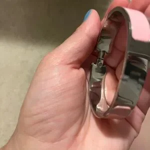 Hermes-inspired H bangle bracelet featuring a sleek silver-tone finish with soft pink enamel inlay. Classic minimalist design with hinge closure for easy wear.