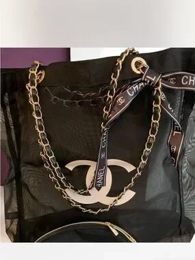 CHANEL mesh tote with prominent CC logo on front. Gold-tone chain strap and branded ribbon detail. Comes with matching black mesh cosmetic pouch. Sleek, lightweight design for everyday use.
